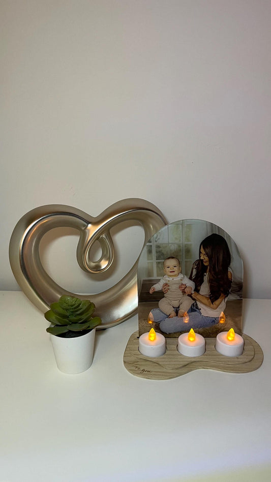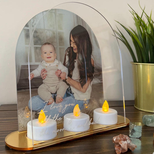 Personalised Acrylic Arch Photo Candle Holder with 3 Candles & Engraved Wooden Base