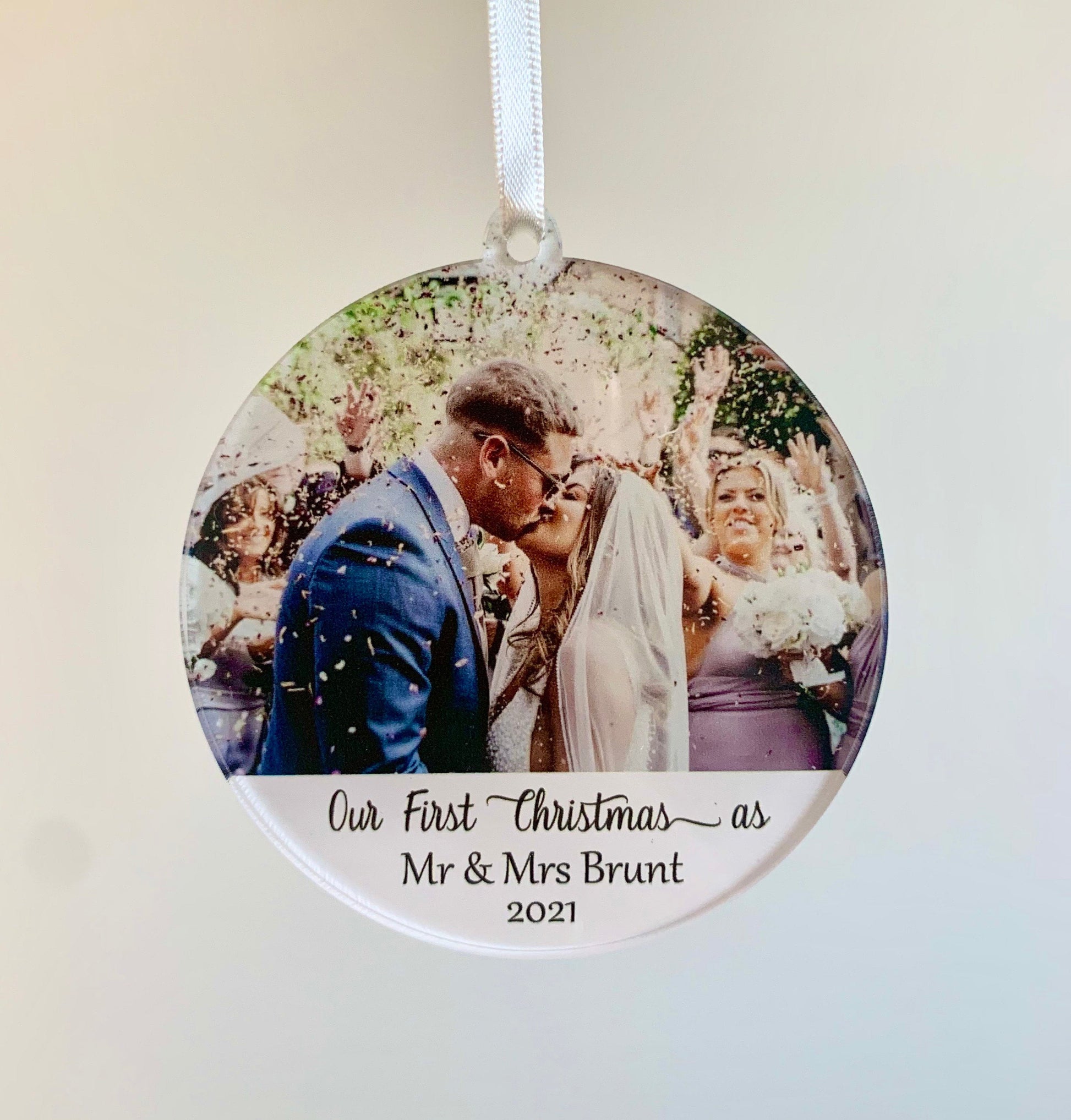 Capture the magic of your first Christmas as a Married couple with our personalised photo bauble. This exceptional ornament allows you to showcase a favourite snapshot from your special day, making it a timeless keepsake filled with cherished memories. Hang it on your tree and let it serve as a beautiful reminder of your love and the joy of your new life together. This unique ornament adds a touch of romance and sentiment to your Christmas décor, celebrating your journey as a married couple.
